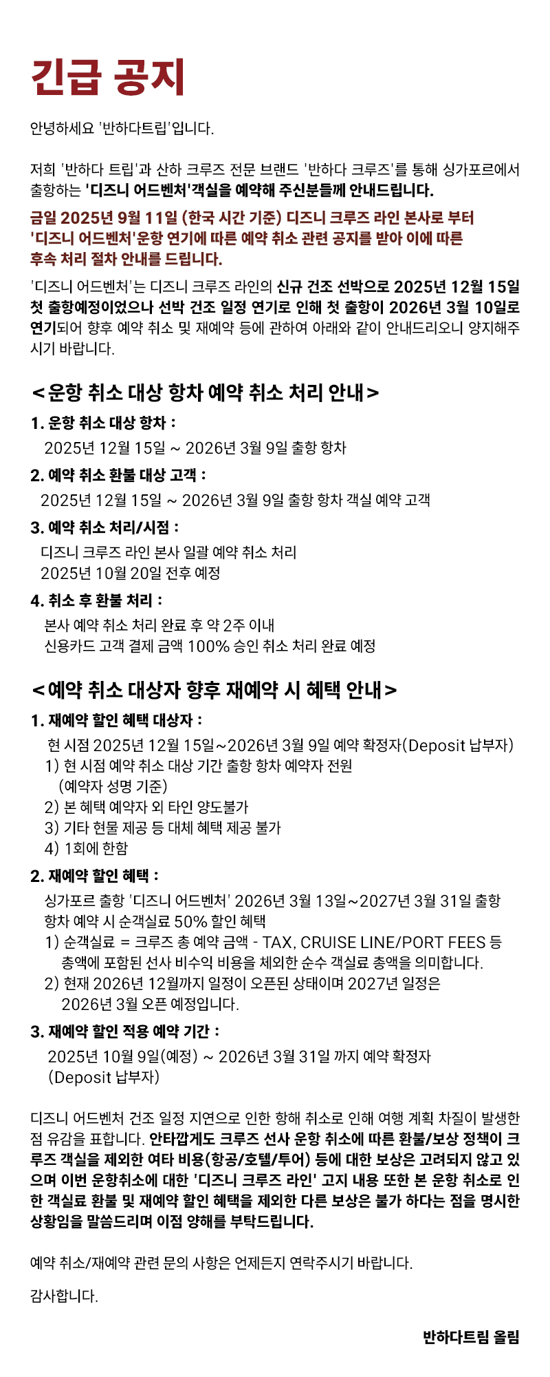 싱가포르 디즈니 어드벤처 운항 지연에 따른